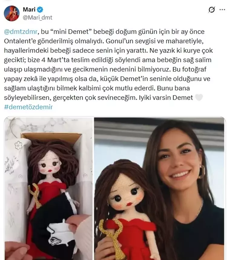 Kullanıcı paylaşımında şu ifadeleri kullandı: “Bu “mini Demet” bebeği doğum günün için bir ay önce Ontalent’e gönderilmiş olmalıydı. Gonul’un sevgisi ve maharetiyle, hayallerimdeki bebeği sadece senin için yarattı. Ne yazık ki kurye çok gecikti; bize 4 Mart’ta teslim edildiği söylendi ama bebeğin sağ salim ulaşıp ulaşmadığını ve gecikmenin nedenini bilmiyoruz. Bu fotoğraf yapay zekâ ile yapılmış olsa da, küçük Demet’in seninle olduğunu ve sağlam ulaştığını bilmek kalbimi çok mutlu ederdi. Bunu bana söyleyebilirsen, gerçekten çok sevineceğim. İyi ki varsın Demet”
