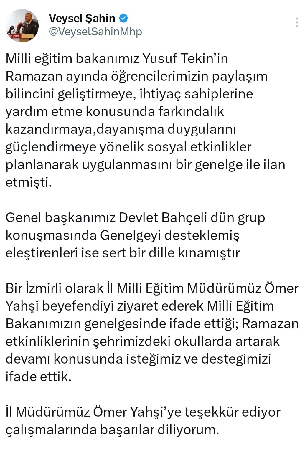 Milli Eğitim İzmir İl Müdürü Ömer Yahşi’ye yaptığı ziyaret ile ilgili bilgi veren İl Başkanı Şahin şunları söyledi: “Milli Eğitim Bakanımız Sayın Yusuf TEKİN’in, Ramazan Ayımız dolayısıyla Türkiye’deki bütün okullarımızda uygulanmak üzere bazı etkinliklerin düzenlenmesi hususunda genelge göndermiştir. Genelge tamamıyla Anayasamıza, din ve vicdan hürriyetimize, cumhuriyet değerlerimize, tüm dinlere saygılı devlet anlayışımıza, insan sevgimize ve milli değerlerimize uygun olarak kaleme alınmıştır. Buna karşı çıkmak, Müslüman Türk çocuklarının bu güzel günlerde din ve vicdan hürriyetini engellemektir! Buna karşı çıkmak, milli değerlerimize karşı çıkmaktır. Buna karşı çıkmak 28 Şubat dönemlerine geri dönmek istemektir.”