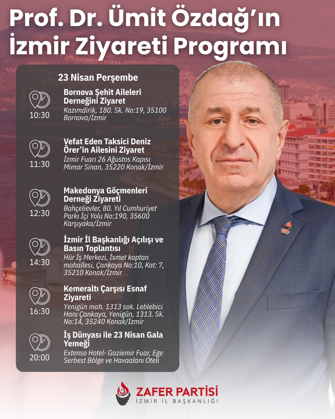 Zafer Partisi Genel Başkanı Sayın Prof. Dr. Ümit Özdağ’ın 23 Nisan 2026 Perşembe İzmir Programı belli oldu.